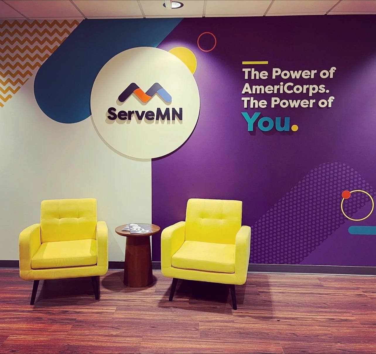 Branded office space to create a welcoming, mission-driven environment that reinforces ServeMinnesota’s impact and inspires both employees and visitors.